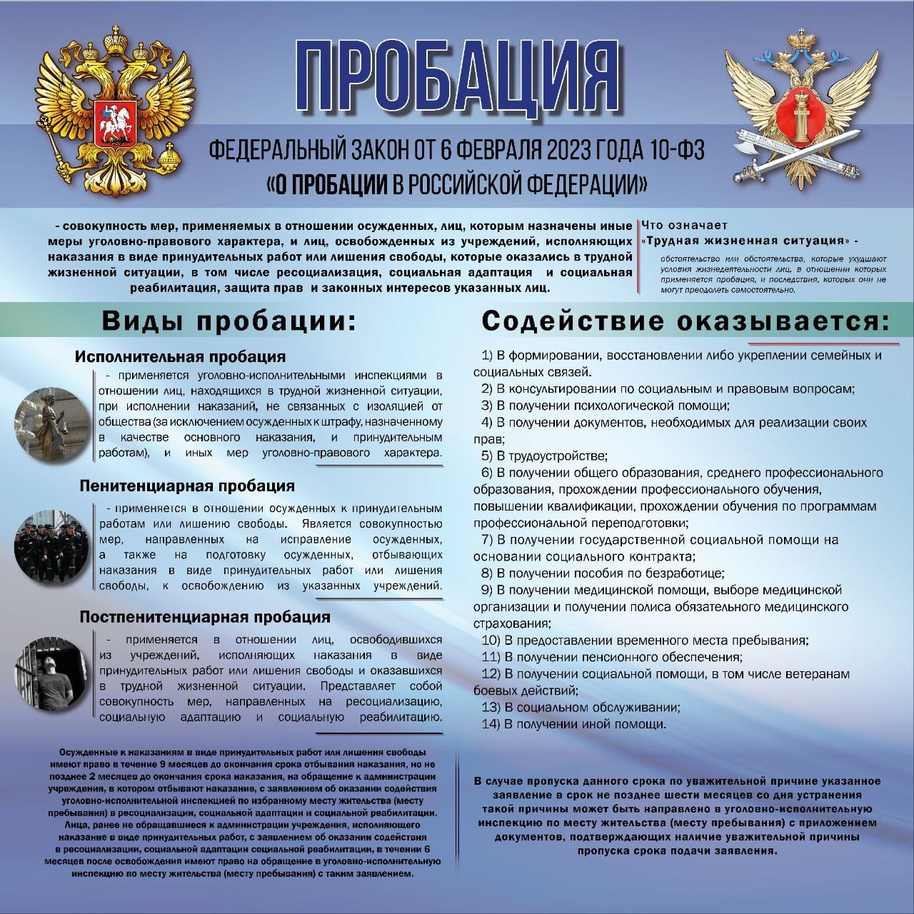 Лица, оказавшиеся в трудной жизненной ситуации, а именно нуждающиеся в восстановлении социальных связей, трудоустройстве, предоставлении временного места жительства, получении образования, реализации права на социальное обслуживание, получении медицинской, психологической и юридической помощи в соответствии с законодательством Российской Федерации имеют право на подачу заявления об оказании содействия. С 01.01.2025 года обеспечена техническая возможность подачи гражданами заявлений о применении пробации посредством единого портала государственных и муниципальных услуг, ссылка на соответствующую услугу размещена на официальном сайте ФСИН России.