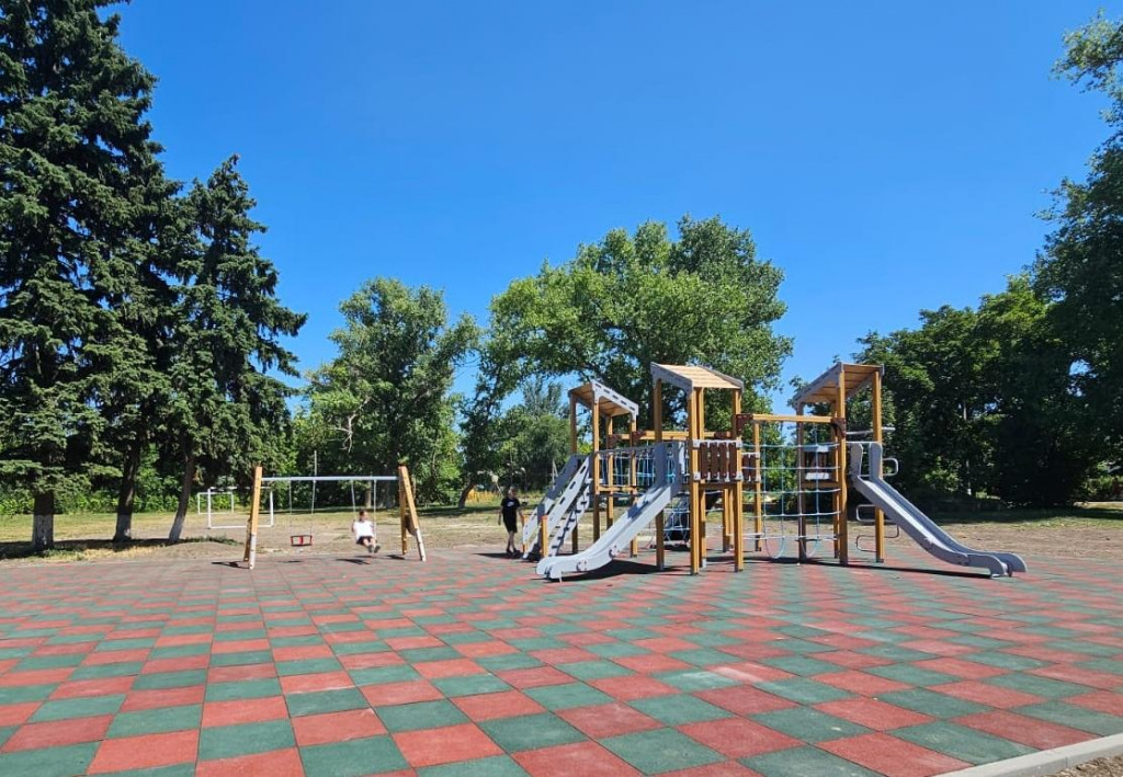 Выполнено устройство основания площадки, укладка резиновой плитки, установка бортовых камней, завершаются работы по установке игрового комплекса, качелей, каруселей, а также спортивного оборудования для игровых видов спорта.